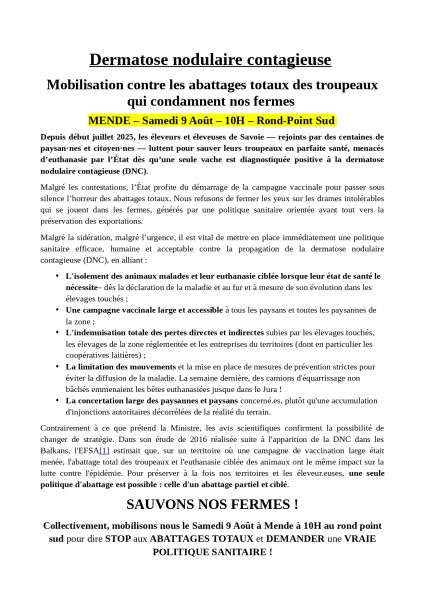 Mobilisation contre les abattages totaux (DNC) : Lozère